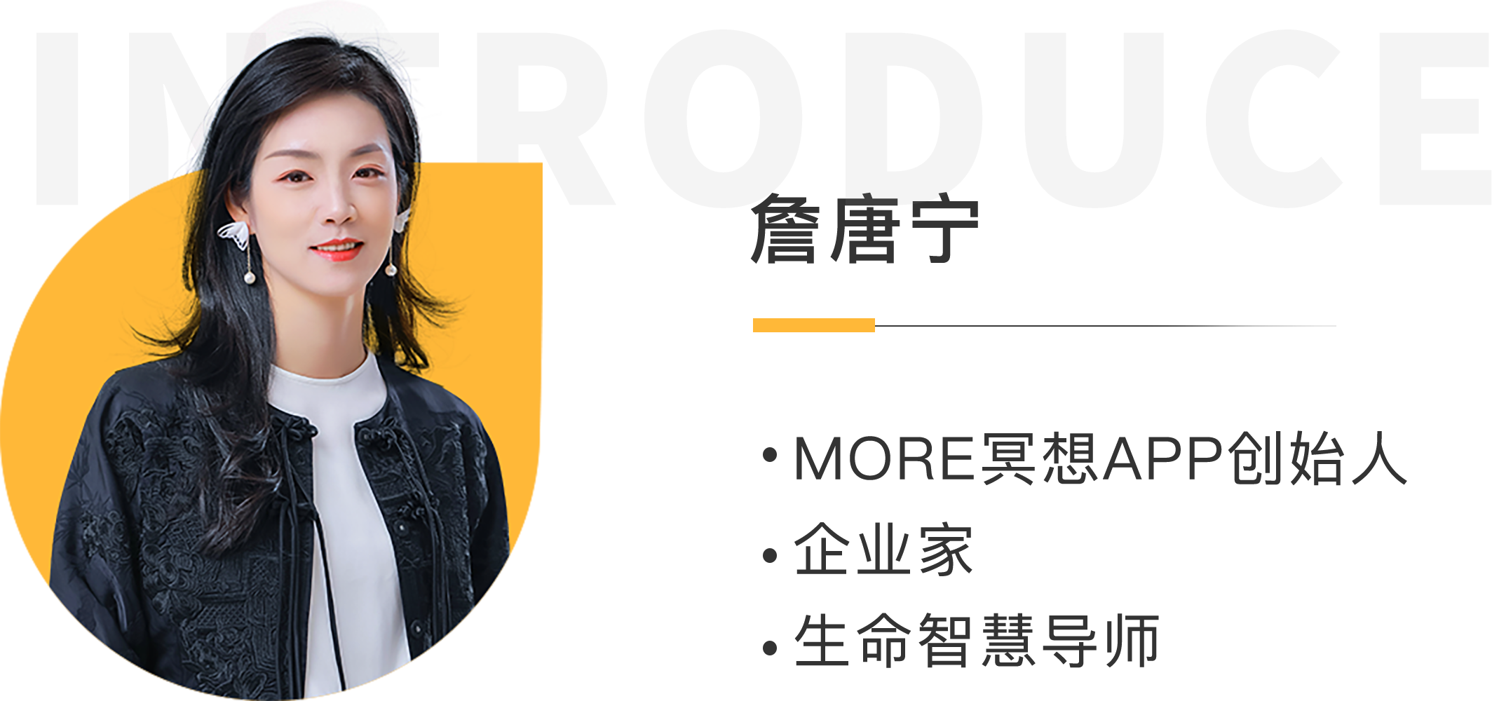 中文名:詹唐宁 别名:唐宁老师 性别:女 国籍:中国 出生日期:1983年1月12日 毕业院校:中山大学 职业:企业家、More冥想创始人、美好活法创始人、生命智慧讲师 主要成就:More冥想APP,创建了悟与服务课程体系,培养上百名生命智慧讲